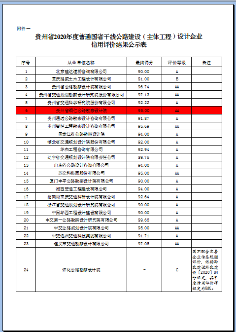 本次评价对象是在2020年度内承担贵州省普通国省干线公路设计、施工任务且有相关资质的设计、施工企业,其中设计企业共23家。地级市设计企业中荣获AA等级的仅有2家,设计公司是其中之一,这是设计公司在全省公路市场良好形象的见证,这不仅增强了公司投标竞争力,更为进一步稳固公路勘察设计市场和公司发展壮大奠定了基础。