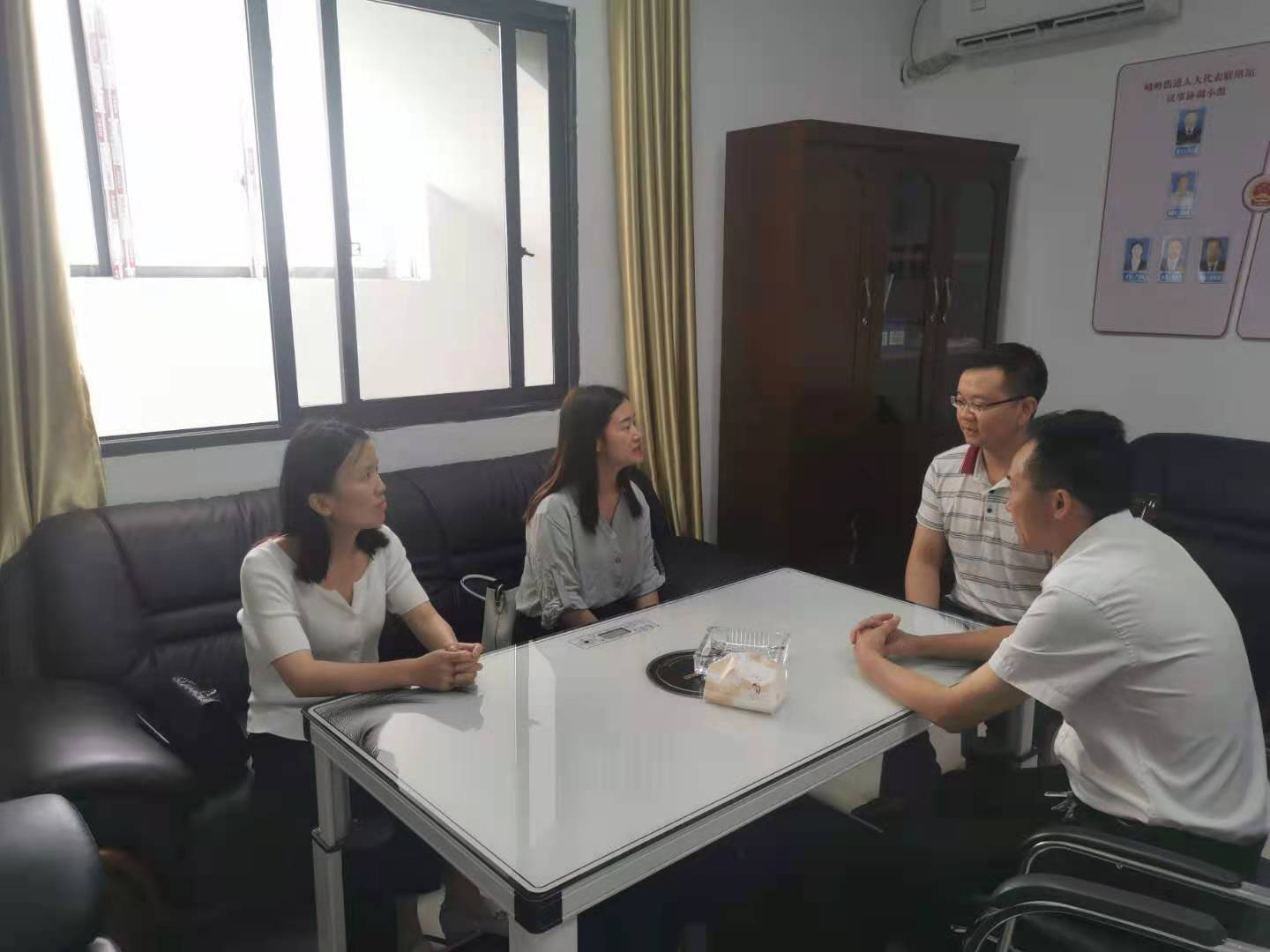座谈中,峨岭街道党工委副书记、兴民社区党支部第一书记杨亚波简单介绍了兴民社区的基本情况。兴民社区一共搬迁1918户,8679人,享受低保578户1639人,目前已实现就业3652人,实现了“一户一人以上就业”,无零就业家庭。在兴民社区创建“四安家园”工作方面,杨亚波说社区按照市场化运行的标准结合红色物业建设来管理,通过扩大党员队伍,发动党员开展社区的志愿者服务,成立“红色哨兵岗”、“红色巡逻队”、“红色义务消防队”公益性组织,延伸便民服务(如代收快递,入户维修,房屋代租等),推选服务模范和标兵等一系列做法,社区管理逐步规范化,群众生活幸福感也逐步得到了提升,但也存在很多问题,由于移民搬迁户文化水平不高,收入低,社区物业费基本收不到,社区管理工作经费就成了大难题,虽然引进了外来企业,由于经营状况不好撤走了,现留下的是本土企业。李妮贵表示兴民社区支部在管理社区工作上,很好的发挥党员们先锋模范作用,其管理经验和做法,及党建工作、阵地建设文化宣传都做得非常好,很值得设计公司学习。对于社区存在的问题,鼓励他们积极向上争取政策支持,多渠道解决。