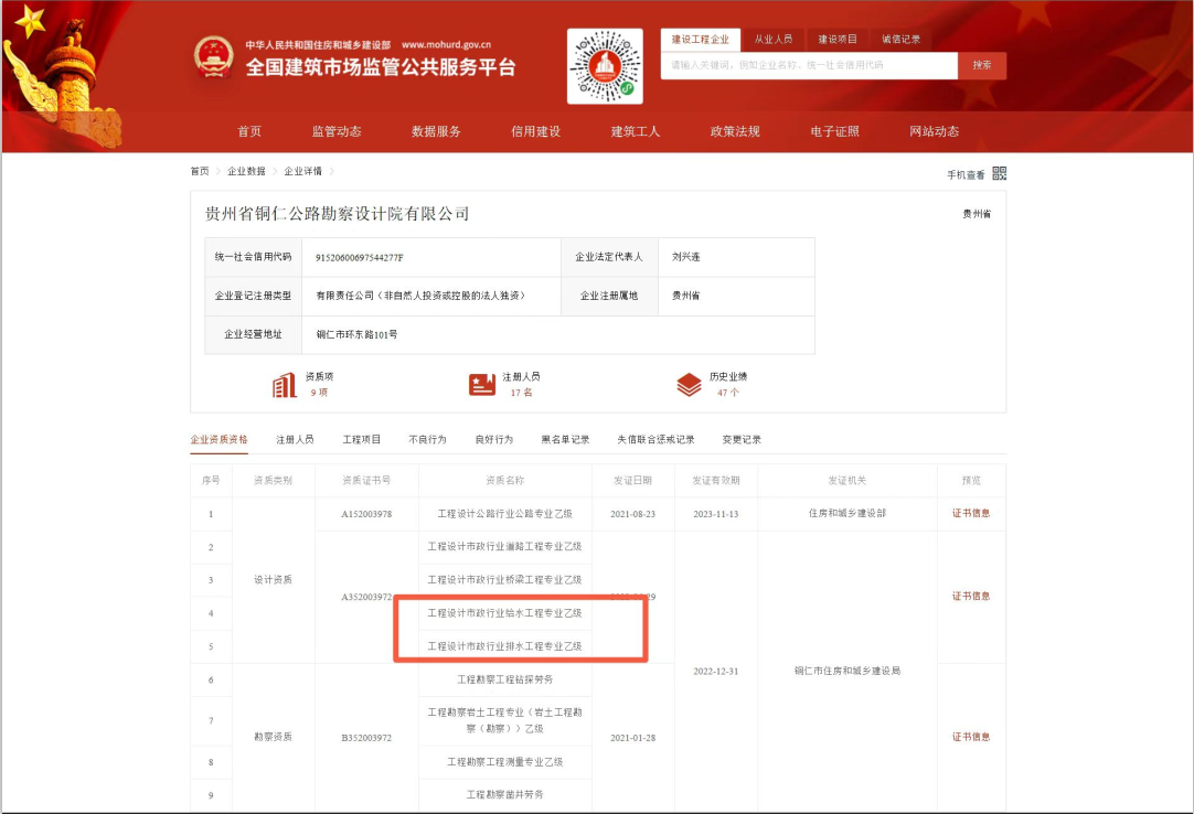 目前,设计公司拥有工程设计公路行业公路专业乙级,市政行业(桥梁工程、道路工程、给水工程、排水工程)专业乙级,工程勘察(岩土工程勘察、工程测量)专业乙级、劳务类(工程钻探、凿井),工程咨询乙级资信评价等级证书(公路专业)。